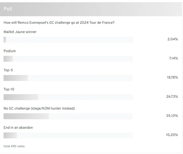 Obwohl Soudal - Quick-Step und Patrick Lefevere weiterhin an Evenepoels Hoffnungen bei der Tour de France 2024 glauben, scheint sich der allgemeine Konsens der Fans nach den Leistungen des Belgiers bei der Dauphine geändert zu haben, wie die Ergebnisse einer kürzlich durchgeführten Umfrage auf unserer Website zeigen.