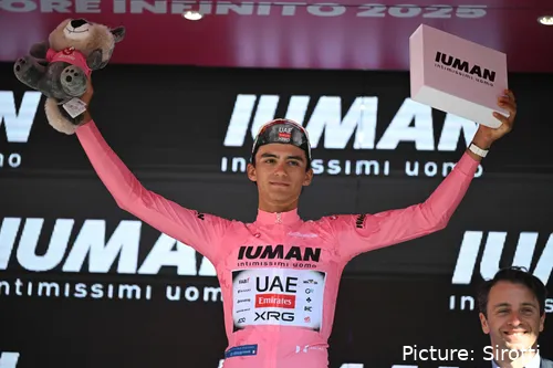 Zur Frage nach dem Druck, das Maglia Rosa zu tragen, gab er eine Antwort, die eine Reife zeigt, wie man sie sonst nur bei den ganz Großen sieht: „Wenn man es so sehen will, ist alles eine Verantwortung, aber am Ende bin ich jung und ich glaube, ich muss das Ganze ein bisschen wie ein Spiel sehen.“