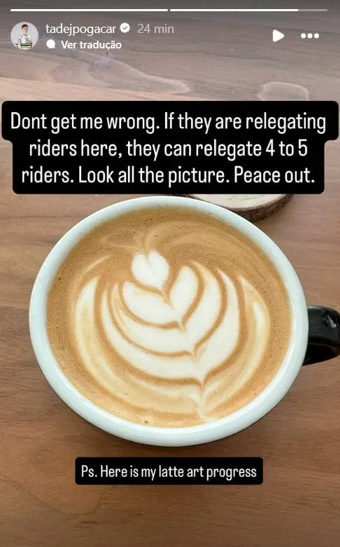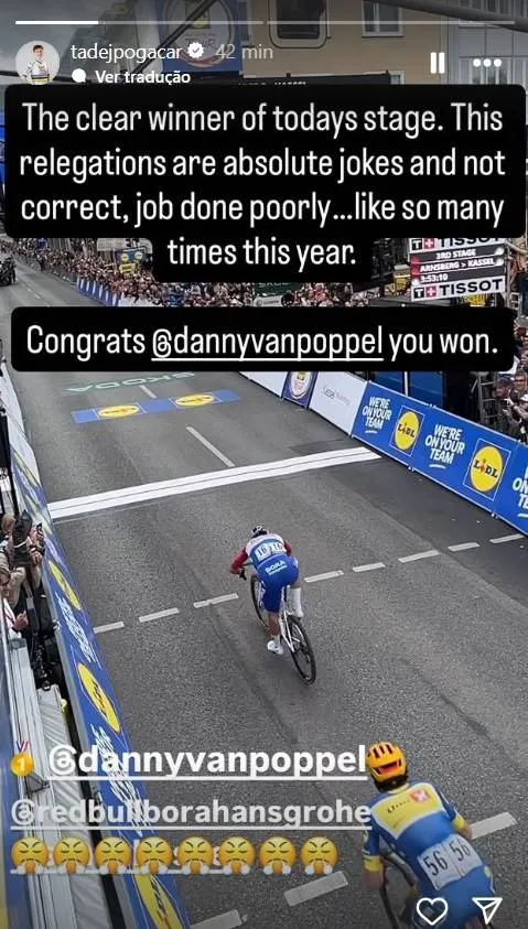 In zwei Instagram-Stories schrieb Pogacar: „Der klare Sieger der heutigen Etappe. Diese Relegationen sind absolute Witze und nicht korrekt, Job schlecht gemacht… wie so viele Male in diesem Jahr. Herzlichen Glückwunsch Danny van Poppel, du hast gewonnen. Versteht mich nicht falsch. Wenn sie hier Fahrer absteigen lassen, können sie vier bis fünf Fahrer absteigen lassen. Schaut euch das ganze Bild an. Peace out.“