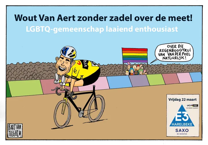 Um sich über den sattellosen van Aert lustig zu machen, veröffentlichte das Rennen eine Karikatur auf seinem offiziellen X-Account (Twitter). "Wout van Aert ohne Sattel im Ziel", lautet die Überschrift. "LGBTQ-Gemeinde begeistert." Als Krönung zeigt die Karikatur eine Gruppe von Menschen in der Menge, die eine Pride-Fahne halten und "über das Regenbogentrikot von Van der Poel" schreien.