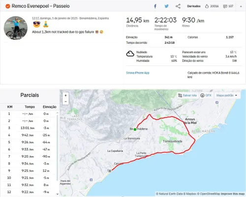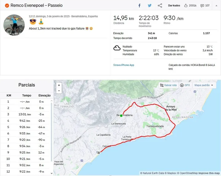 Diesmal war es keine Radtour, sondern ein Spaziergang von 15 Kilometern Länge - oder 16,3, wie er selbst schreibt, der wegen eines GPS-Ausfalls nicht aufgezeichnet wurde. Der Belgier hält sich derzeit in Spanien auf und genießt das gute Wetter, während Nordeuropa unter einem harten Winter leidet.