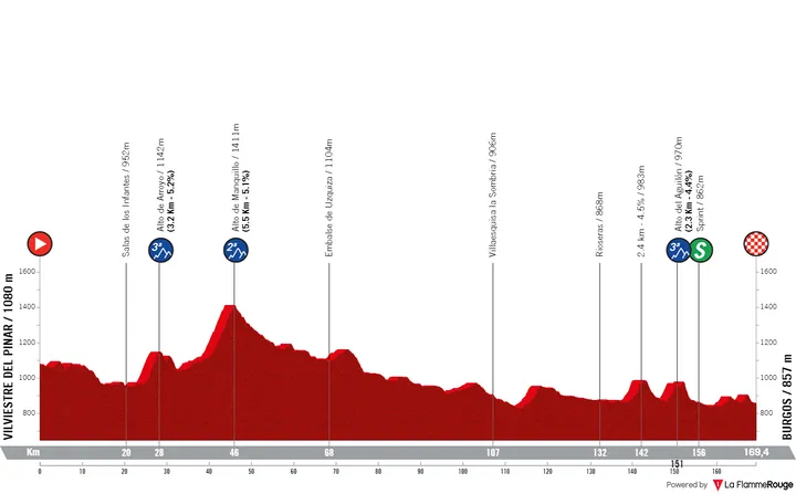 Das Rennen beginnt mit einer explosiven Etappe, die wie üblich in Burgos endet. Doch dieses Mal geht es nicht hinauf zur Burg, sondern mit einem Sprint in der Stadt zu Ende. Es ist jedoch nicht sicher, dass dies ein Rennen für die Sprinter sein wird, denn auf den letzten Kilometern gibt es einige Kuppen, die als Abschussrampen für späte Angriffe dienen können.