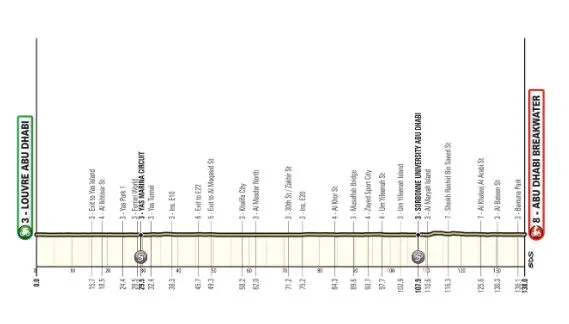 100 Höhenmeter an einem Tag für die Sprinter, eine Etappe rund um die Stadt Abu Dhabi. Vom Louvre Abu Dhabi aus führt der erste Teil der Strecke nach Saadiyat Island und dann nach Yas Marina, wo das Rennen in Richtung Westen weitergeht, bevor es durch Khalifa City wieder in die Stadt hineinführt. Die Strecke kehrt nach Abu Dhabi City zurück und führt über Al Reem Island (Sorbonne Universität Abu Dhabi) und Al Maryah Island. Über Qasr Al Hosn nähern sich die Fahrer dem Ziel von Süden nach Norden und erreichen den Abu Dhabi Breakwater.
