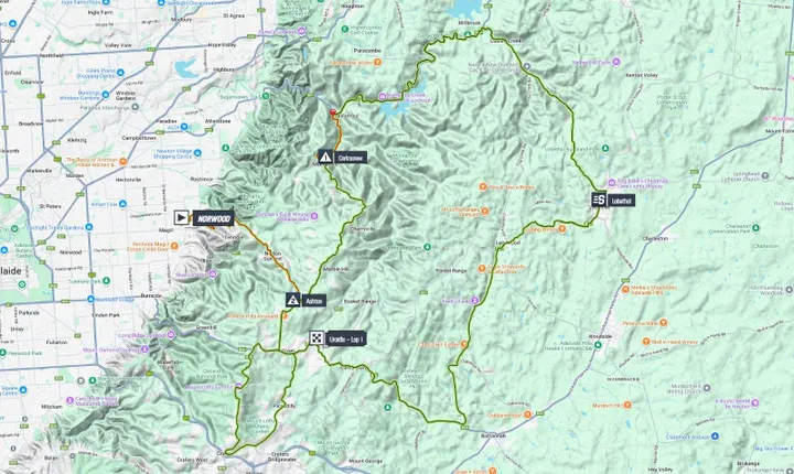 Die 2. Etappe nach Uraidla ist der erste echte GC-Prüfstein, mit ernsthaftem Kletteranteil. Direkt nach dem Start in Norwood geht es bergauf, eine 9 Kilometer lange Steigung. In diesem Rennen sehen wir selten große Fluchten oder aggressive Starts, doch wenn es sie gibt, dann hier.