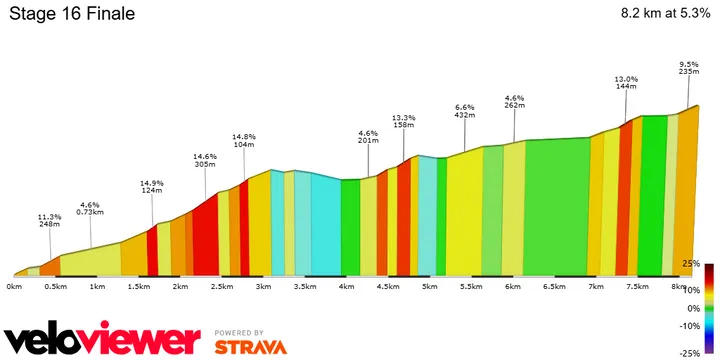 8,9 km bei 4,1 % und noch 85 km zu fahren; 11,4 km bei 5,4 % und noch 58 km zu fahren... Dann ein nicht kategorisierter Anstieg mit 34 Kilometern, der 3,7 Kilometer lang ist und 6,8% aufweist; der steilste Anstieg des Tages mit einem Bonussprint auf dem Gipfel, er ist 3,2 Kilometer lang und 8,9%... In der Mitte der Abfahrt zum Schlussanstieg gibt es noch eine Kuppe, die für einen Überraschungsangriff genutzt werden kann, aber der Schlussanstieg ist dann der Hauptgang auf der Speisekarte.