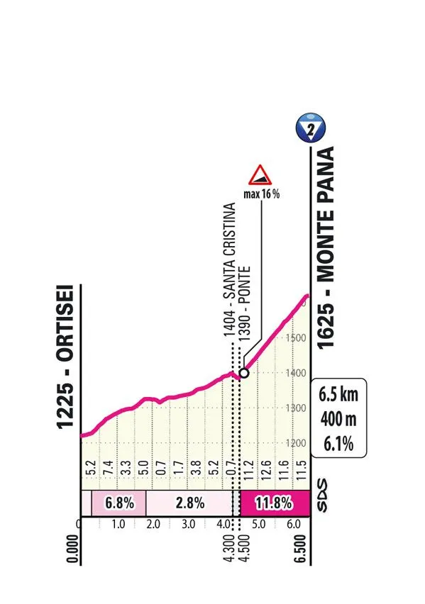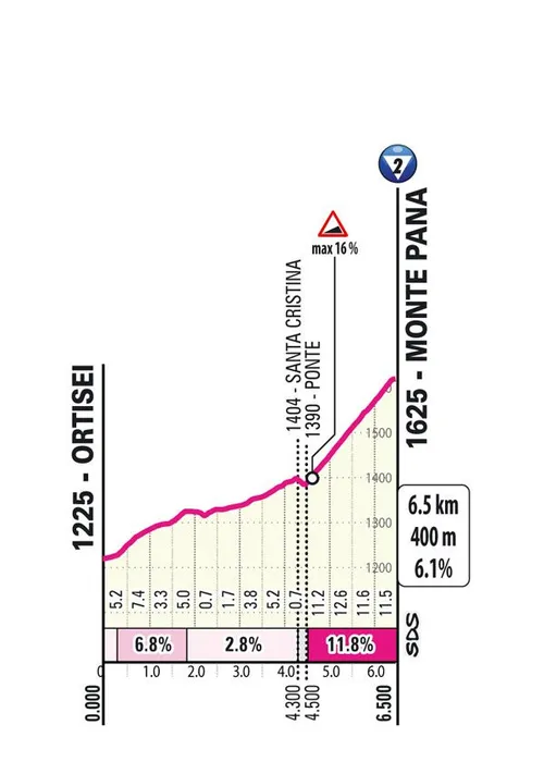 Aber wie am Vortag steht der letzte Anstieg noch bevor, der kleiner und steiler ist. Der Anstieg zum Monte Pana ist 6,5 Kilometer lang und hat eine Steigung von 6,2 %. Die letzten 2 Kilometer haben eine Durchschnittssteigung von 12 %, ein unglaublich steiles Finale eines brutalen Radtages, auf das viele Fahrer vielleicht nur warten. Sie kann, obwohl sie kurz ist, einen großen Unterschied machen.