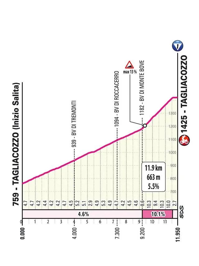 Der Schlussanstieg nach Tagliacozzo ist etwas über 12 Kilometer lang bei durchschnittlich 5,5 %. Doch die letzten zwei Kilometer haben es in sich: mit rund 10 % im Schnitt wird es richtig schwer. Wer nicht in Topform ist, riskiert hier bereits viel Zeit zu verlieren – und geht mit großem Druck in die kommenden Schlüsseltage.