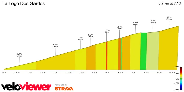 Dieser Anstieg ist 6,7 km lang und hat eine durchschnittliche Steigung von 7,1 %. Alles in allem ein weitgehend konstanter Anstieg ohne allzu viele Steigungsveränderungen, aber er wird von der Basis an hart sein. Auf den letzten Kilometern ist mit Attacken zu rechnen, denn wenn eine Gruppe in die letzten 1,5 Kilometer geht, gibt es dort eine kleine Verschnaufpause, ansonsten könnte es zu einem Sprint kommen.