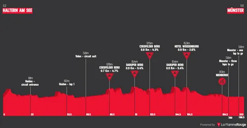 Die Strecke ist 203 Kilometer lang und weist im Mittelteil des deutschen Eintagesrennens einige kurze und explosive Anstiege auf. Es ist kein allzu schweres Finale, aber es gibt ein paar Höhen und Tiefen vor der Ankunft in der Stadt Münster. Quelle:
