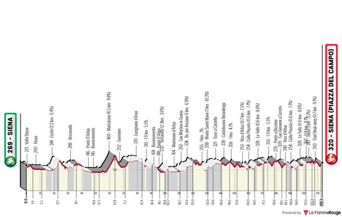 Wenn die Anwärter in einer Gruppe fahren, wird die Entscheidung in den engen Gassen von Siena fallen. Die Via Santa Caterina ist eine der berühmtesten Straßen des Radsports, und Sie können sicher sein, dass wir einige großartige Bilder erleben werden. Die entscheidende Rampe wird in ihrem steilsten Abschnitt (700 Meter, 9 Prozent Durchschnittssteigung) bis zu 16 Prozent betragen und die letzten Kurven ins Herz von Siena werden eine letzte Gelegenheit sein, andere Fahrer zu überholen.