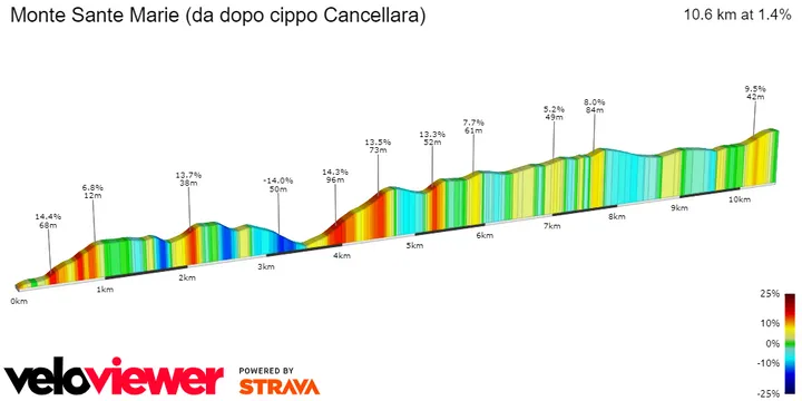 Der Monte Sante Marie ist vielleicht der erste entscheidende Abschnitt des Rennens. Er endet nach etwas mehr als 72 Kilometern und weist einen ganzen Kilometer mit 10 Prozent Steigung auf. Die schiere Größe und die Vielfalt der Steigungen in diesem Abschnitt machen ihn jedoch zu einem brutalen Abschnitt, der das Rennen unweigerlich sprengen wird.