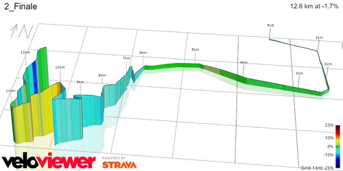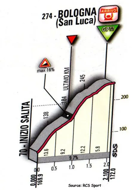 Die Etappe endet jedoch nicht am Gipfel des Anstiegs, anders als der italienische Klassiker, den sie krönt. Eine kurze Abfahrt folgt unmittelbar vor einer weiteren kleinen Kuppe mit 5 % über einen ganzen Kilometer. Eine technische Abfahrt führt die Fahrer dann hinunter nach Bologna. Die letzten 6 Kilometer sind dann völlig flach und untechnisch. Lücken können geöffnet oder geschlossen werden, aber dies wird definitiv ein Tag, der nur von denjenigen bestritten wird, die gut klettern können, während man definitiv einen Kampf um das gelbe Trikot erwarten kann.