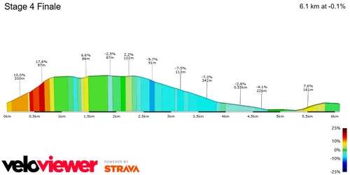 Die letzten 30 Kilometer der Etappe sind tückisch und könnten entscheidend für den Etappensieg sein: 1,3 km bei 9,2 % Steigung (28 km vor dem Ziel), 900 m bei 7 % (20 km), 1,8 km bei 4,8 % (12 km) und schließlich 800 m bei satten 9,1 % nur 5 km vor dem Ziel. In Wahrheit wird das Rennen einem schleichenden Leadout gleichen, bis zur finalen Rampe, die mit bis zu 17 % Steigung alles sprengen kann.