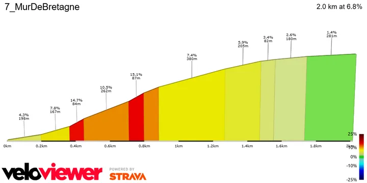 Es wird ein Tag, an dem die Fahrer alles für die letzten zwei Kilometer aufsparen. Diese weisen im Schnitt 6,9 % Steigung auf. Auf den ersten Metern liegt die durchschnittliche Steigung bei 10 % auf einer geraden Passage, danach wird sie allmählich flacher. Das macht diesen Schlussanstieg besonders anspruchsvoll.