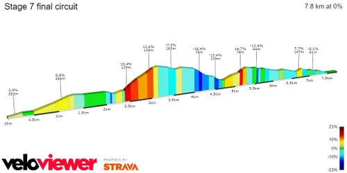 Ein Anstieg, der 2,4 Kilometer lang ist und 4,7 % aufweist, aber die Steigung ist sehr irreführend, da er einen flachen Abschnitt enthält. Die eigentliche Kuppe ist ziemlich explosiv, sie hat 900 Meter bei 10 %, was genug ist, um im Feld Schaden anzurichten, und auch Splits, die sich als entscheidend für die Gesamtwertung erweisen können. In der letzten Runde sind es nur noch 5 Kilometer bis zum Gipfel, die alle bergab führen, mit Ausnahme eines kleinen Anstiegs in der Nähe des Olympiastadions der Stadt, 2 Kilometer vor dem Ziel.
